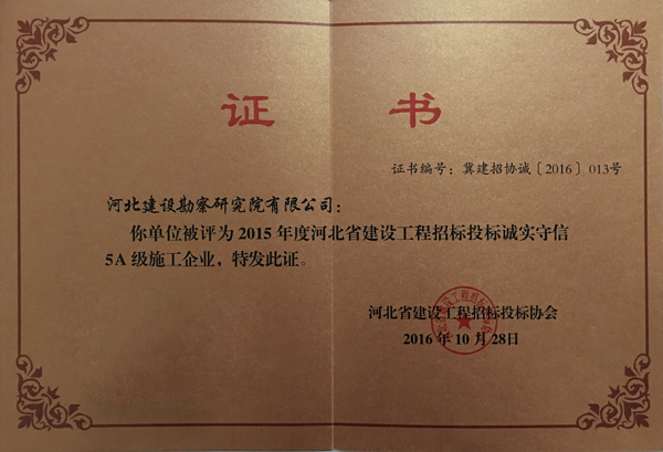 近日,公司被河北省建設(shè)工程招標(biāo)投標(biāo)協(xié)會評為2015年度河北省建設(shè)工程招標(biāo)投標(biāo)誠實(shí)守信5A級施工企業(yè)單位。