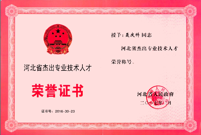近日,經河北省人民政府批準,公司總工程師聶慶科同志榮獲“河北省杰出專業技術人才” 榮譽稱號。