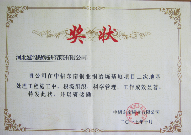 公司承接的福建省寧德市中鋁東南銅業銅冶煉基地項目二次地基處理工程,施工中嚴格執行公司規章制度及綜合管理體系標準,精心策劃,嚴格控制,科學管理。在現場10多家施工單位各項檢查評比中,得到了業主中鋁東南銅業有限公司的表揚,對現場安全、質量、進度管理給予了高度評價,分別授予“項目管理突出”獎和“質量管理”獎。