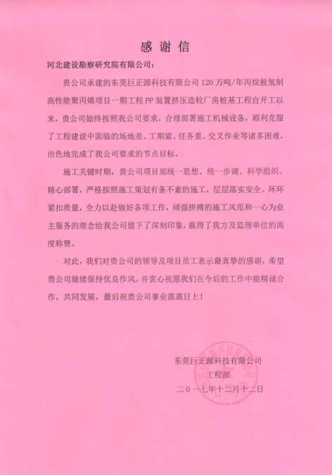 我公司承建的東莞巨正源科技有限公司120萬噸/年丙烷脫氫制高性能聚丙烯項目一期工程—PP裝置擠壓造粒廠房、PDH裝置反應框架鉆孔灌注樁基礎工程,克服了施工過程中褚多困難,按照合同節點圓滿完成施工任務。東莞巨正源科技有限公司近日發來感謝信,對公司領導及項目員工表示最真摯的感謝。