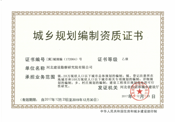 經過艱苦努力,我公司于2017年12月25日取得了城鄉規劃編制乙級資質證書,可承擔20萬現狀人口以下城市總體規劃的編制,登記注冊所在地城市和100萬現狀人口以下城市相關專項規劃的編制,以及建設工程項目規劃選址的可行性研究。