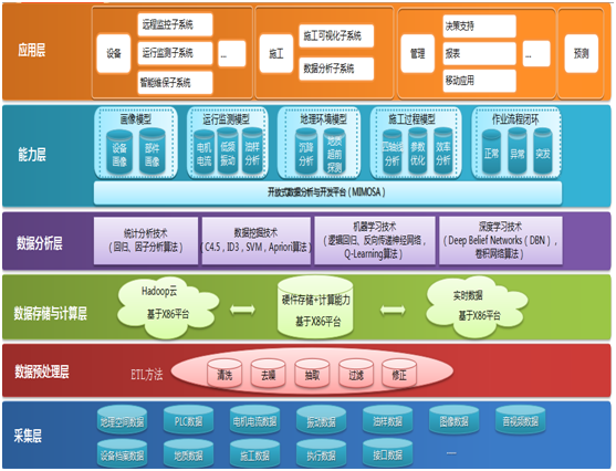 本項目在研究盾構的運行狀態進行監控和管理的基礎上,將盾構運行狀態參數及工況數據,通過采集終端經PLC、光纖、路由器、VPN隧道傳輸至遠程數據中心,數據存儲使用工業級實時數據庫,采集頻率可達毫秒級。業務基礎—對各類盾構機(機、電、液)深入分析,提供盾構軌跡、管片軌跡、單環分析、掘進效率等統計分析功能,以便管理決策層把握各項目施工情況。構建盾構/TBM施工與健康管理平臺,實現以下四個功能:1、盾構遠程監控,2、智能維保,3、盾構施工輔助巡航,4、組態化模塊定制。進行盾構施工大數據相關性、關聯分析、影響因素分析,關鍵子系統健康管理和故障診斷,基于大數據的比較、聚類、預測實現對盾構施工進行遠程管理。