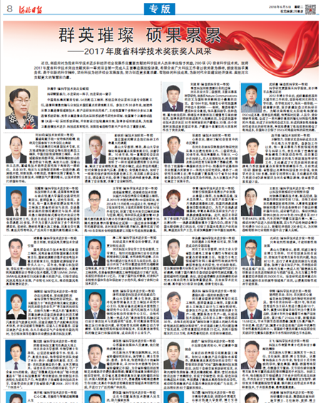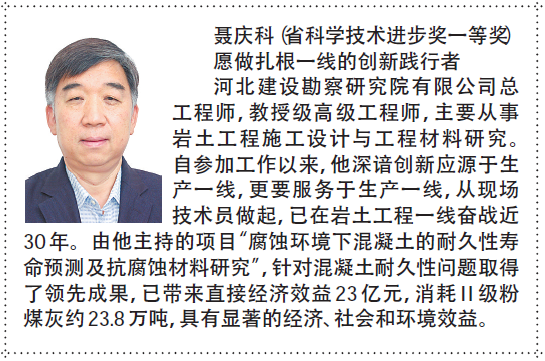 6月5日,河北日報專版文章《群英薈萃 碩果累累》對2017年度河北省科學技術獎獲獎人風采進行展示。我公司的完成的《腐蝕環境下混凝土的耐久性壽命預測及抗腐蝕材料研究》獲得一等獎,聶慶科總工程師作為第一完成人在專版文章中進行了刊載,這是以聶總為代表的廣大專業技術人員的共同光榮,也必將激勵我們更加努力爭創新的科技成果和榮譽。