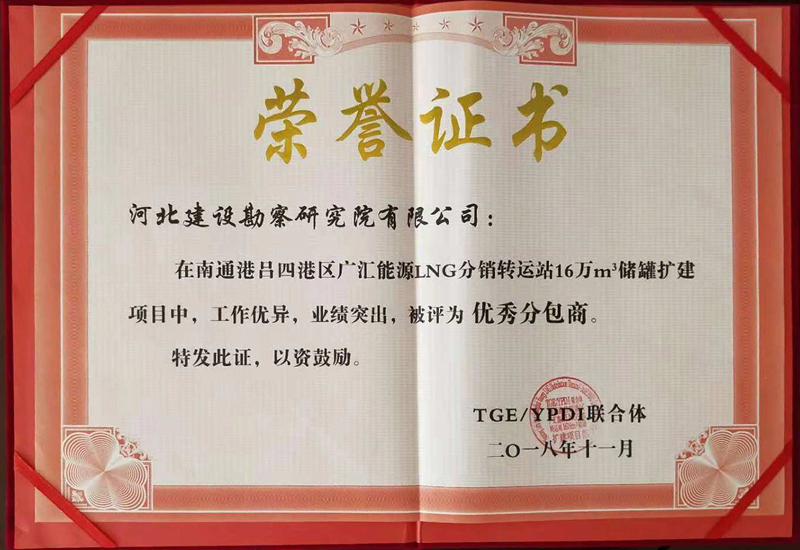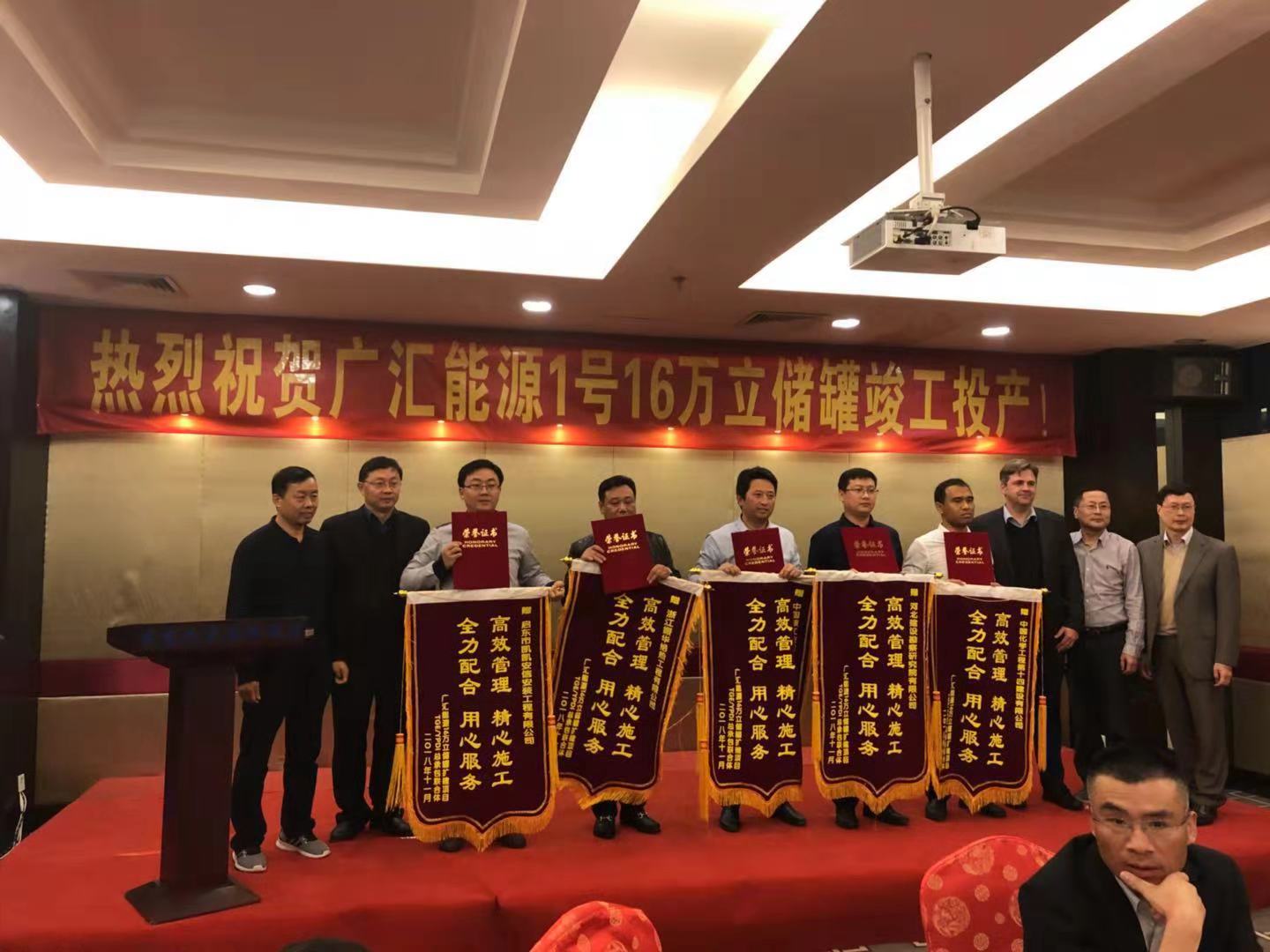 2018年11月21日,廣匯能源1號16萬m³儲罐項目順利投產,并創造了LNG行業新的記錄。在竣工投產慶功會上,廣匯能源總經理和TGE總經理對我公司在項目中的突出貢獻給予了高度贊揚,并授予錦旗和“優秀分包商”證書,同時也對我公司在2號16萬立方儲罐施工過程中的優秀表現提出了表揚,并期望我公司更多的參與廣匯能源的項目建設。