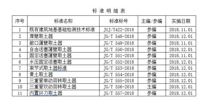 近日,國家住房和城鄉建設部發布公告,批準我公司主編的建筑工業行業產品標準《三重管雙動回轉取土器 JG∕T 549-2018》、參編的《既有建筑地基基礎檢測技術標準JGJ/T422-2018》等共十一項標準,正式發布實施。