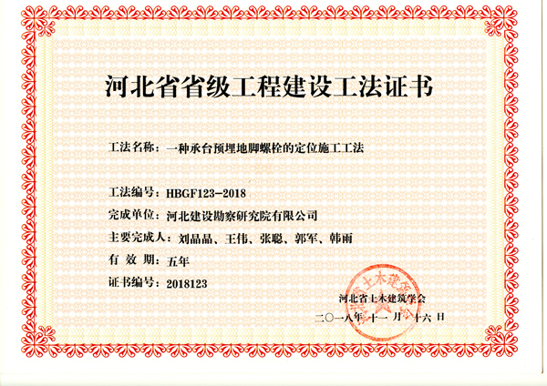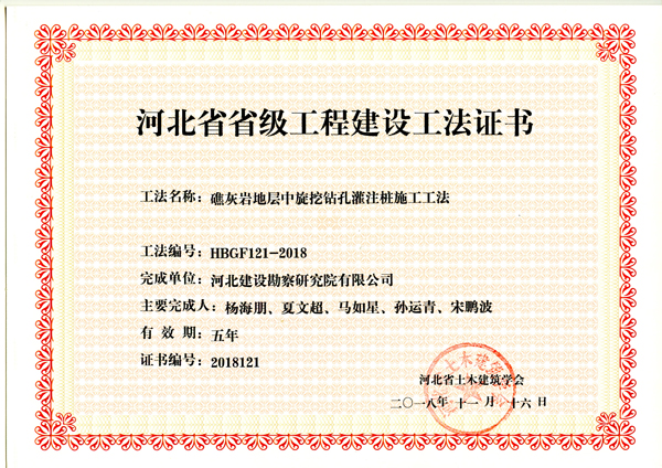 近日,河北省土木建筑學(xué)會(huì)組織專家對建筑施工企業(yè)申報(bào)工法進(jìn)行了評審,我公司申報(bào)的礁灰?guī)r地層中旋挖鉆孔灌注樁施工工法、鉆孔灌注樁泥漿凈化處理施工工法、一種承臺(tái)預(yù)埋地腳螺栓的定位施工工法,被評為2018年度省級工程建設(shè)工法。