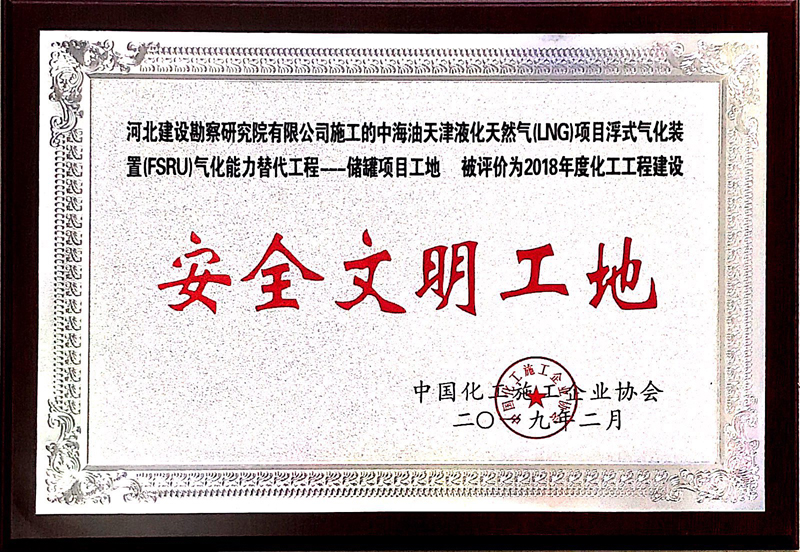 我公司天津液化天然氣項目被中國化工施工企業協會評為“2018年度化工工程建設安全文明工地”