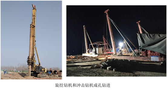 本工程主要包括從黃河左岸大堤位置起,大橋主橋17#、18#和19#墩三個墩的樁基工程,主要工作內容為:成孔、水下混凝土灌注和配合樁基檢測。自2018年11月22日開工,2019年5月19日全面竣工,共計179天,投入旋挖鉆機TR360D 1臺,沖擊鉆機6臺,空壓機1臺,泥漿處理器1臺。施工完成后,經相關單位檢測和驗:本工程鉆孔成孔深度、成孔直徑符合設計要求;入巖深度和巖石強度符合設計要求;樁基超聲波檢測合格率100%,優良率100%。