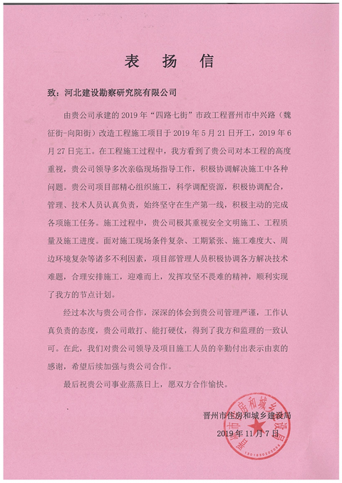 公司收到晉州市住房和城鄉建設局表揚信