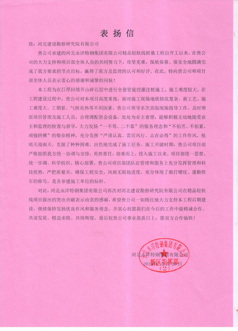 近日,我公司河北永洋特鋼集團(tuán)有限公司精品輕軌線樁基工程收到河北永洋特鋼集團(tuán)有限公司的表揚(yáng)信。項目部全體員工大力發(fā)揚(yáng)“一不等、二不靠”的服務(wù)理念和“不怕苦、不怕累、頑強(qiáng)拼搏”的敬業(yè)精神,充分發(fā)揮“嚴(yán)謹(jǐn)認(rèn)真、雷厲風(fēng)行、志在必得”的工作作風(fēng),搶晴天戰(zhàn)雨天,克服了種種困難,出色地完成了施工任務(wù)。甲方對項目部全體員工的辛勤付出,給予了高度認(rèn)可和評價,并為后續(xù)雙方的合作奠定了良好基礎(chǔ)。并衷心祝愿我們在今后的工作中能精誠合作、共謀發(fā)展、精益求精、共鑄輝煌。