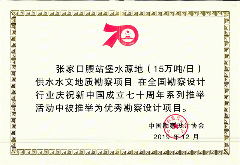 其中,我公司榮獲“優秀勘察設計企業”榮譽稱號,董事長韓立君榮獲“優秀企業家”稱號,總工程師聶慶科榮獲“科技創新帶頭人”榮譽稱號。我公司完成的張家口腰站堡水源地(15萬噸/日)供水水文地質勘察項目、廣西信發鋁電有限公司年產160萬噸氧化鋁赤泥堆場巖土工程勘察項目被推舉為優秀勘察設計項目。