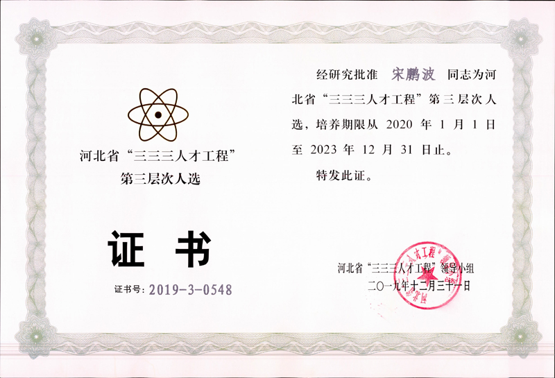 經(jīng)公司推薦,石家莊市人力資源和社會(huì)保障局組織評(píng)審,省人力資源和社會(huì)保障廳備案,我公司宋鵬波、楊海賓兩位同志榮獲2019年度河北省“三三三人才工程”第三層次人選。