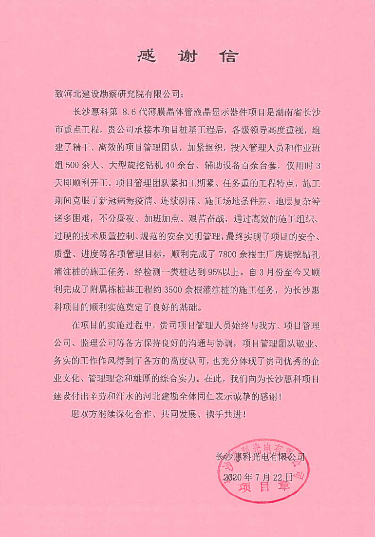 公司承建的長沙惠科光電有限公司長沙惠科第8.6代超高清新型顯示器件生產線項目樁基工程,近日收到業主長沙惠科光電有限公司的感謝信。感謝信中對我公司項目管理團隊敬業、務實的工作作風,以及安全、質量管理工作給予了高度的肯定和認可。向為長沙惠科項目建設付出辛勞和汗水的河北建勘全體同仁表示誠摯的感謝!愿雙方繼續深化合作、共同發展、攜手共進!