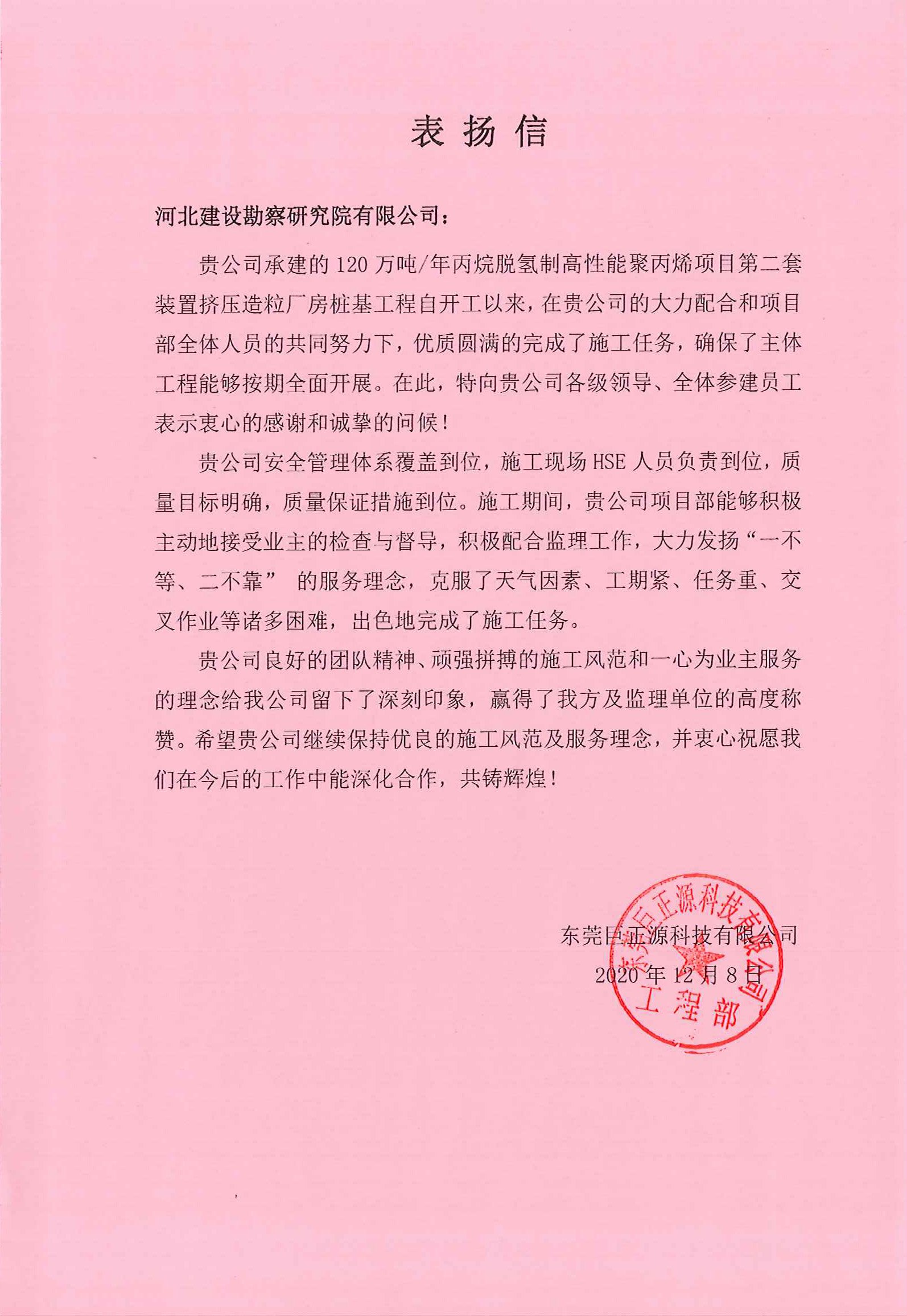 東莞巨正源120萬噸/年丙烷脫氫制高性能聚丙烯項目第二套裝置擠壓造粒廠房樁基工程自開工以來,安全管理體系覆蓋和質(zhì)量保證措施到位,大力發(fā)揚“一不等、二不靠”的服務(wù)理念,克服了工期緊、任務(wù)重、交叉作業(yè)等諸多困難,出色地完成了施工任務(wù)。特向公司各級領(lǐng)導(dǎo)、全體參建員工表示衷心的感謝和誠摯的問候!