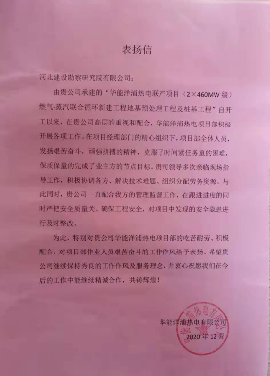 華能洋浦熱電聯(lián)產(chǎn)項目(2×460MW級)燃?xì)?蒸汽聯(lián)合循環(huán)新建工程地基預(yù)處理工程及樁基工程自開工以來,積極開展各項工作,精心組織,克服了時間緊任務(wù)重的困難,保質(zhì)保量完成了節(jié)點目標(biāo)。特對項目部的吃苦耐勞、積極配合,對項目部作業(yè)人員艱苦奮斗的工作作風(fēng)給予表揚。