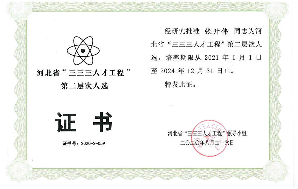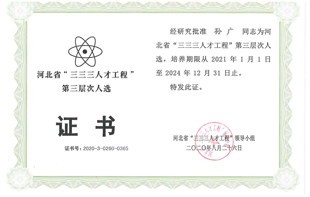 經(jīng)公司申報、石家莊市人力資源和社會保障局推薦,河北省“三三三人才工程”領導小組批準,公司張開偉同志榮獲2020年度河北省“三三三人才工程”第二層次人選,韓文永、孫廣兩名同志榮獲2020年度河北省“三三三人才工程”第三層次人選。