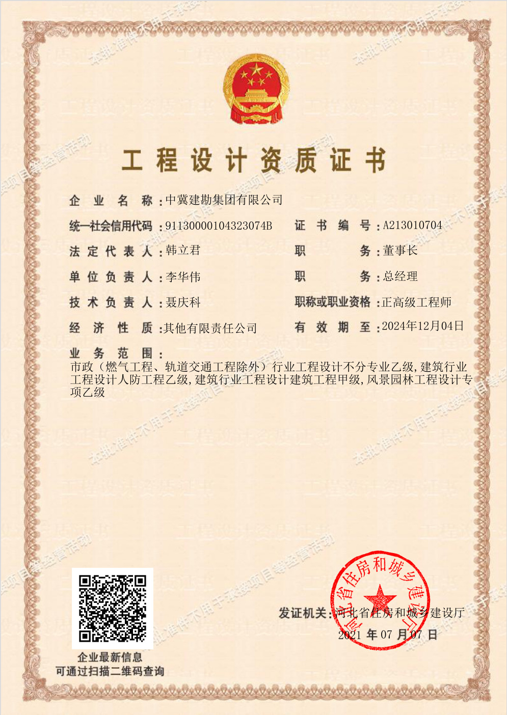 公司于2021年7月7日取得了風景園林工程設計專項乙級資質證書,可承擔中型以下規模風景園林工程項目和投資額在2000萬元以下的大型風景園林工程項目的設計。