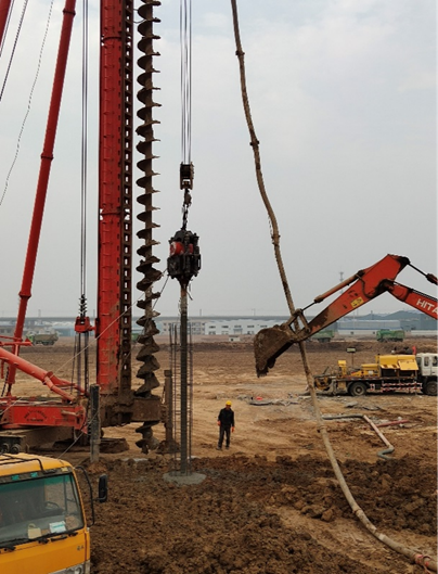 本工程2#、3#廠房樁基成孔采用長螺旋后插筋工藝,混凝土壓灌完成后,進行鋼筋籠安放工作,鋼筋籠安放采用25T吊車和振桿、震動器(采用閉合式鏈接)配合進行。鋼筋籠下入孔中后,保證在孔內居中,先由鋼筋籠量與振錘自身的重量讓鋼筋籠自行下沉,當不能自行下沉時(約達到3/1-3/2籠長時),立即開動震錘,邊振動混凝時鋼筋籠邊隨著下沉,鋼筋籠隨著振動下沉至到樁頂標高位置后,采用雙吊筋固定鋼筋籠位置,緩慢將導管從樁身中拔出,并開動震錘,即完成了該樁的施工。當遇見孔口下沉現象時,先用人工清理出表面混凝土,再由鉆機開至孔口進行補方。