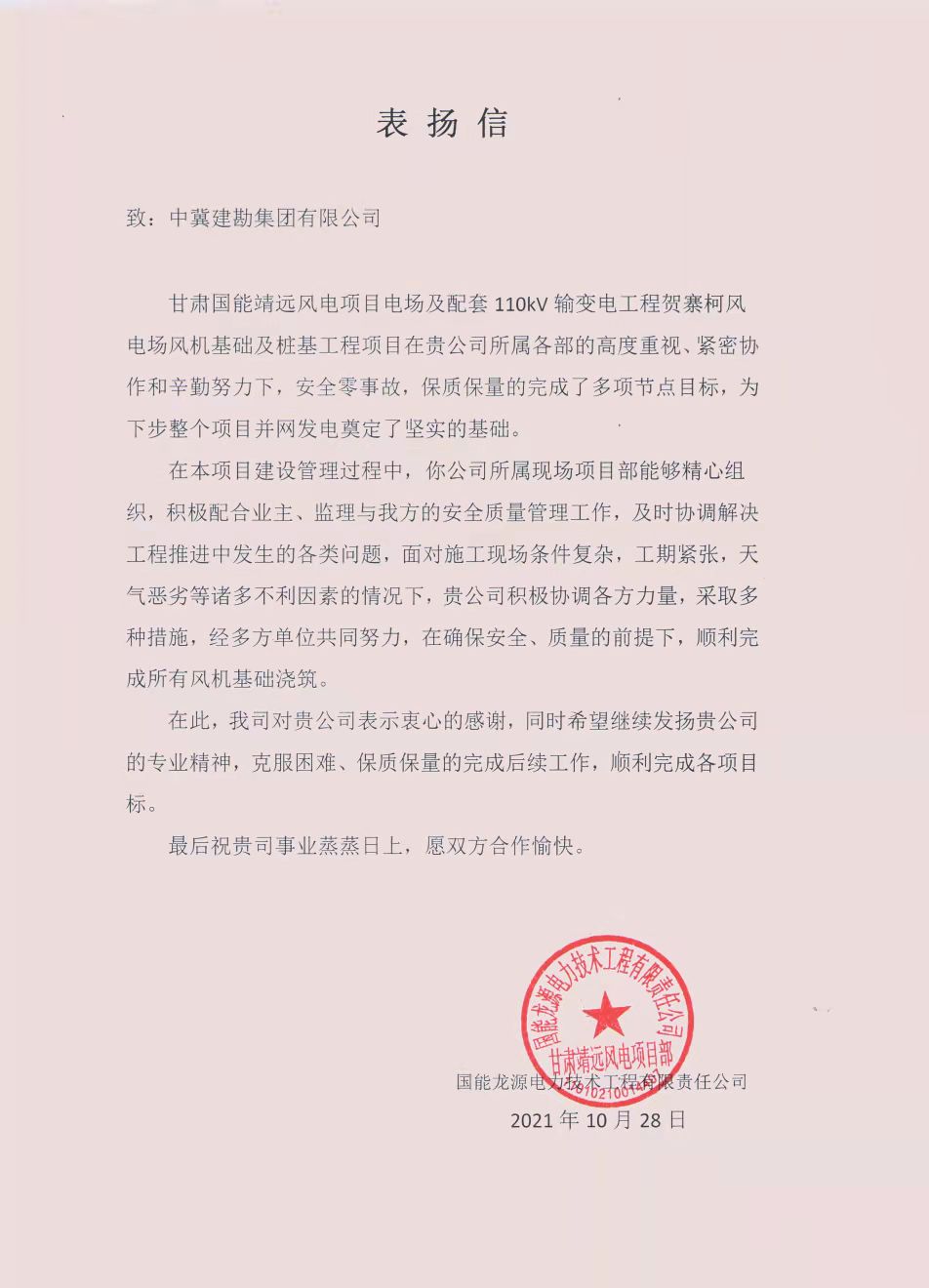 江蘇鳳城梅里500千伏線路工程長江大跨越項目樁基工程,甘肅國能靖遠風電項目電場及配套110KV輸變電工程賀寨柯風電場風機基礎及樁基工程項目業主向我公司發來表揚信,并頒發了“進度、質量管理先進單位”榮譽證書,同時,武衛新、朱凱云、黃長楠被評為“優秀項目管理者”榮譽稱號。