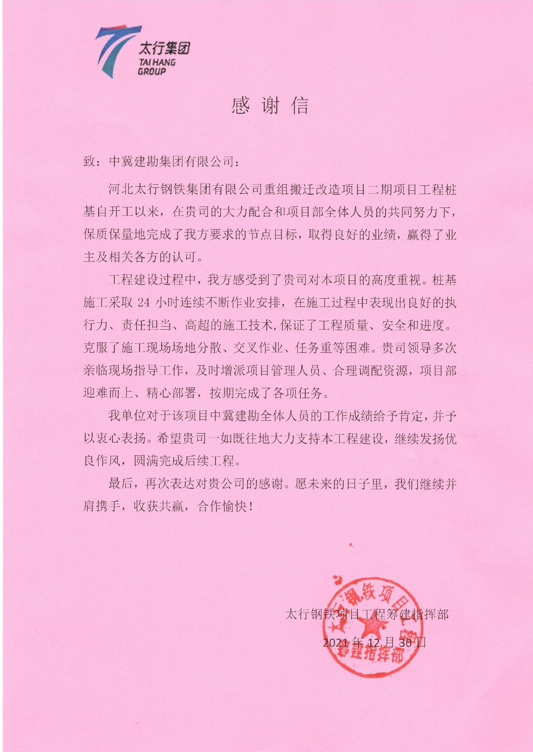 河北太行鋼鐵集團有限公司重組搬遷改造項目二期項目樁基工程位于河北武安工業園區南洺河工業園。本項目包括焦電聯產、二期發電、洗煤廠及二期1座高爐等附屬設施。施工期間迫于業主工期要求,不斷增加區域和設備,同時涉及多處交叉施工,給施工開展及管理帶來了一定難度。通過公司的大力支持、項目部的統籌安排以及全體人員的辛苦付出。面對規模較大、場地分散、交叉施工等多項不利因素,項目全體人員盡職盡責,確保項目順利開展,整個施工期間未發生安全質量事故,各項指標均滿足合同要求,充分發揮建勘精神。得到了業主的認可和贊揚,并收到業主發來的表揚信,為以后更多的合作奠定基礎。