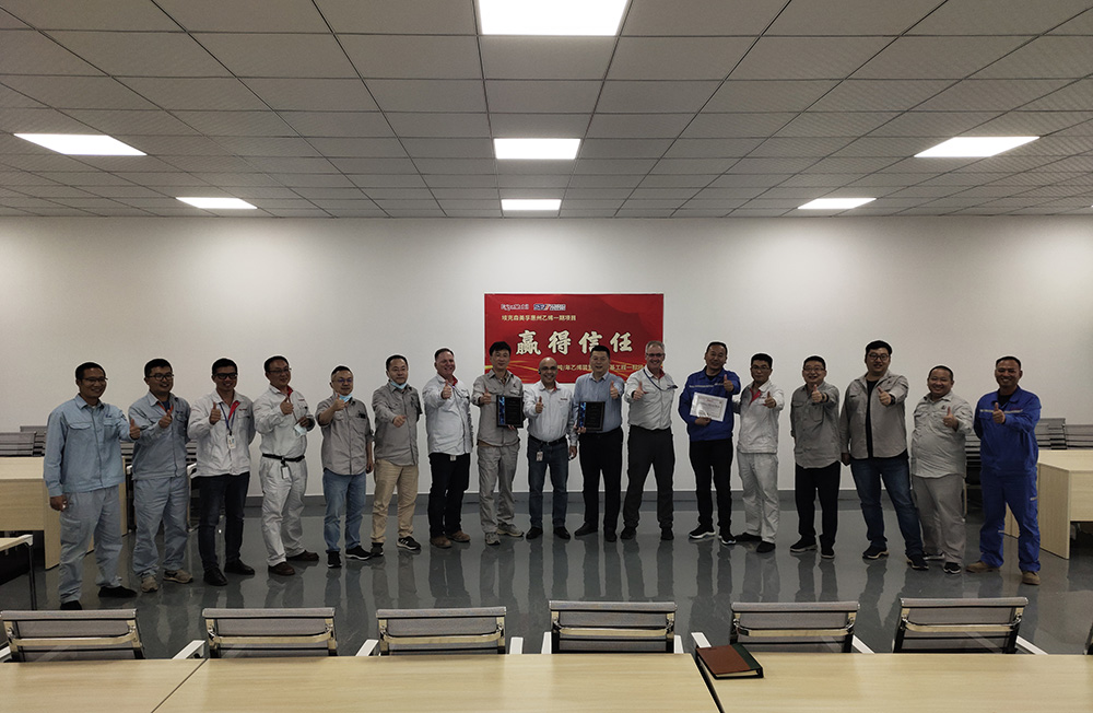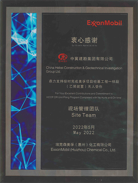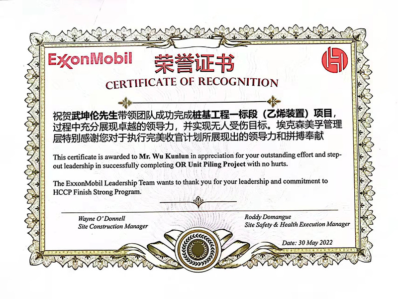 5月30日,??松梨冢ɑ葜荩┗び邢薰菊匍_2022年工作表彰大會,我公司參建的惠州美孚乙烯一期樁基工程項目部,在參建的30余家施工單位中以優異的成績,榮獲“優秀管理團隊”稱號,生產設備科科長兼項目經理武坤倫榮獲 “卓越領導力”個人榮譽證書,項目部每位員工都收到了業主頒發的獎品。