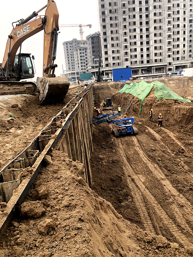 本工程位于雄安新區,由中電建河北雄安智匯城建設發展有限公司投資建設,我公司負責本項目基坑支護和樁基施工,共完成噴面約3290m²、土釘約5580m、錨索約6580m、鋼腰梁約2620m、鋼板樁打拔約4600m、擋水墻約212m;鉆孔灌注樁共完成420余根,其中直徑0.6m工程樁完成50余根,直徑0.8m工程樁完成370余根;