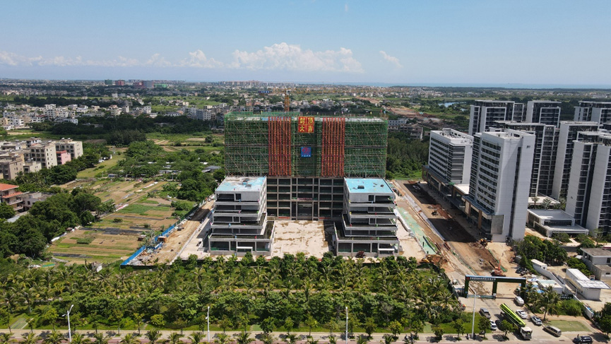 海南辦公樓占地面積15畝,地下二層,地上12層,總建筑面積47527平方米。工程自2021年9月13日現場舉辦開工儀式以來,經過11個月的合力攻堅,克服高溫、臺風、疫情等重重難關,如期實現了一個個關鍵節點:2021年10月25日第一根基礎工程樁混凝土灌注順利完成;2021年12月4日開始8萬方土方開挖的任務;2022年1月29日,實現了基礎筏板的澆筑;2022年4月10日,完成了地下二層車庫施工,主體如期“沖”出正負零;2022年6月24日,東、西配樓主體按計劃日期封頂。如今項目迎來了主體封頂的里程碑,為后期工程樹立了標桿!