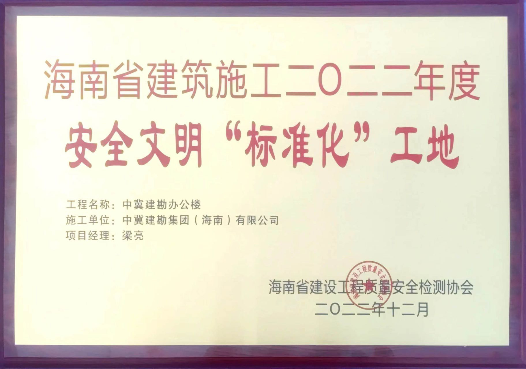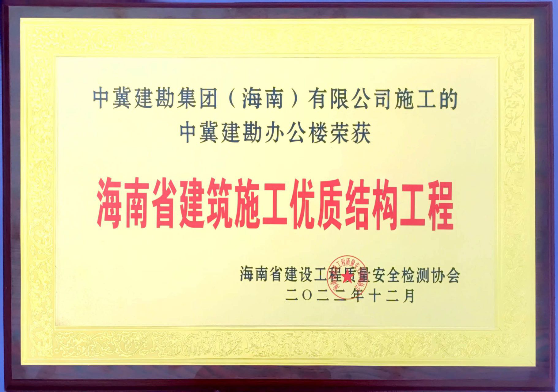 中冀建勘辦公樓榮獲“海南省建筑施工優(yōu)質結構工程”及海南省建筑施工二0二二年度安全文明“標準化”工地榮譽稱號