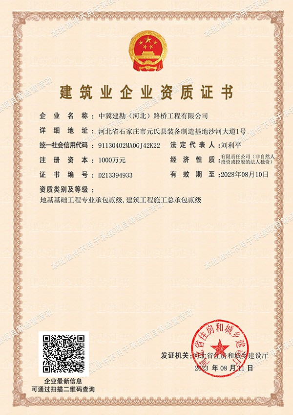 2023年8月11日,經河北省住房和城鄉建設廳審批,中冀建勘(河北)路橋工程有限公司順利取得了建筑工程施工總承包貳級、地基基礎工程專業承包貳級資質。