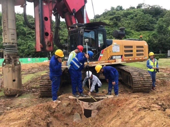 在進行GIS區域樁基施工過程中,發現該施工區域的地下管線走向及位置與建設單位提供的竣工圖不符。項目部積極與設計、監理、業主等單位協調溝通,采用人工挖探坑、金屬探測儀等方式探明地下管線,在保證施工進度的同時也避免了因地下管線問題造成的施工事故。