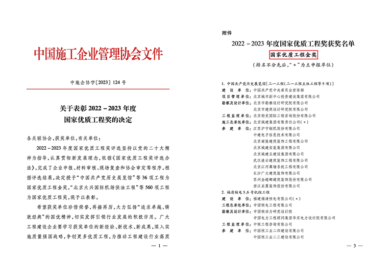 12月9日,中國施工企業管理協會發布了《關于表彰2022-2023年度國家優質工程獎的決定》(中施企協字[2023]124號),我公司參與建設的3項工程獲得國家優質工程獎,其中1項工程獲得國家優質工程金獎。