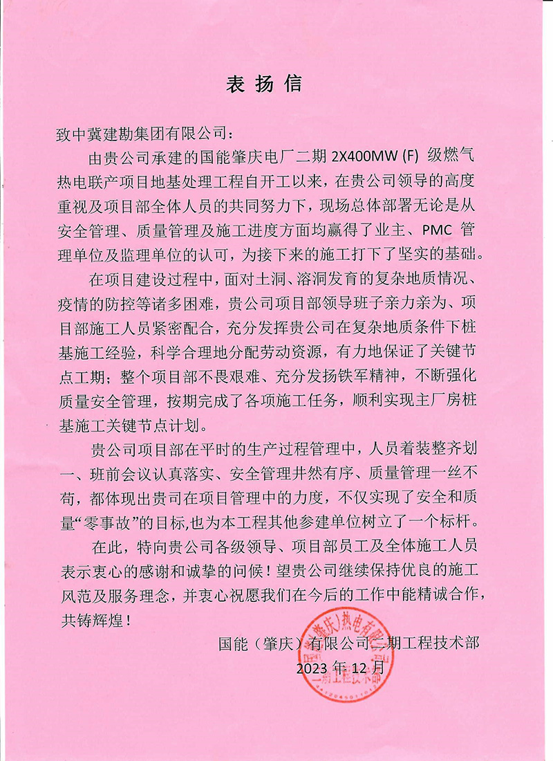 國能肇慶電廠二期2×400MW(F)級燃氣熱電聯產項目為二期擴建工程,在總公司及領導們的幫助下攻堅克難,面對土洞、溶洞發育的復雜地質情況、疫情的防控等諸多困難,充分發揚鐵軍精神,不斷強化質量安全管理,積極配合業主進度計劃,按期完成了各項施工任務。我單位在安全管理、施工質量管理方面為建設方、PMC管理單位、監理方留下深刻影響,為此項目部得到了國能(肇慶)熱電有限公司的高度認可!