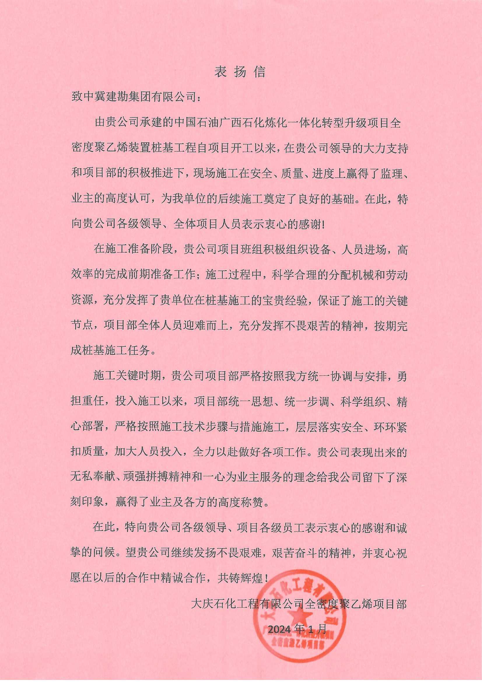 廣西石化煉化項目部接收到大慶石化工程有限公司全密度聚乙烯工程建設部項目經理牛家偉發來的表揚信,信中肯定了我項目部在廣西石化煉化項目樁基工程中所取得的成果。