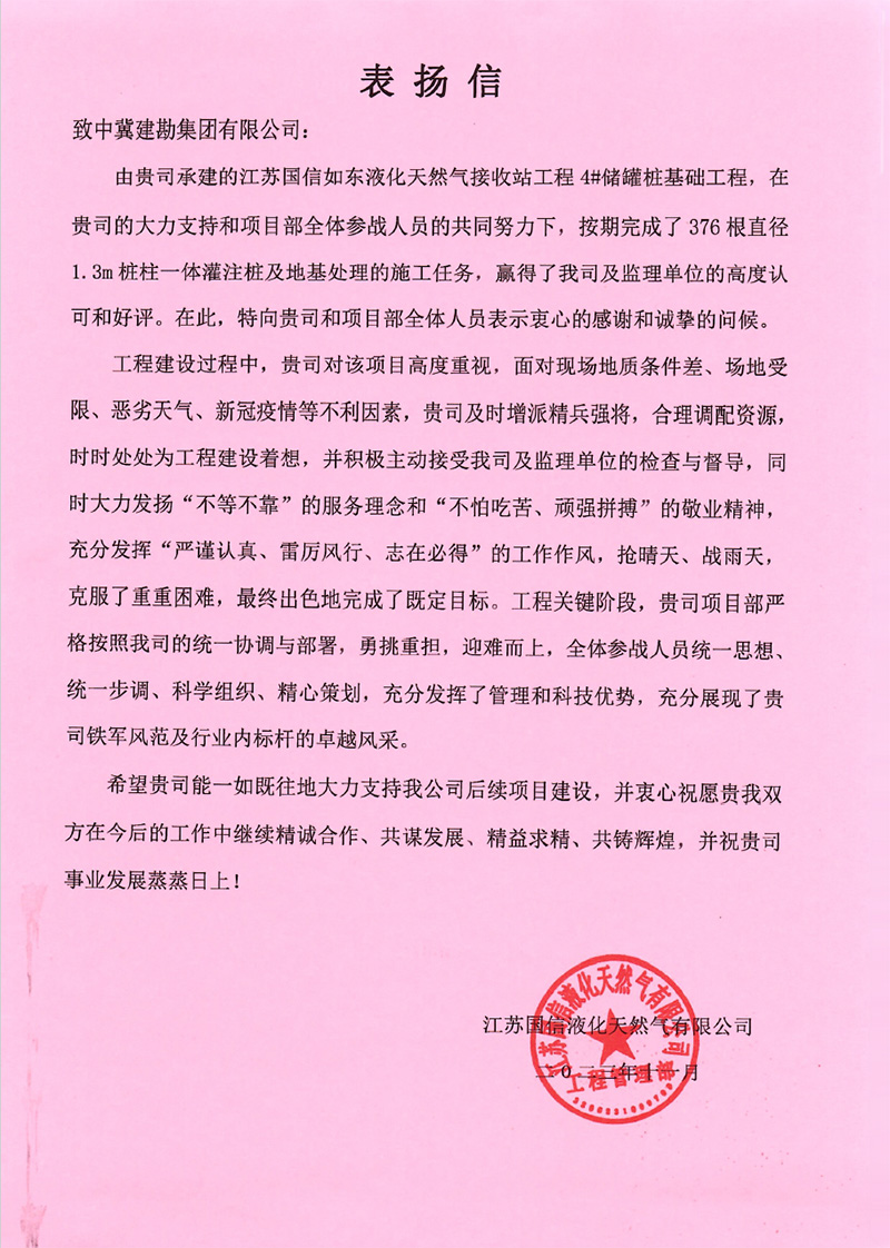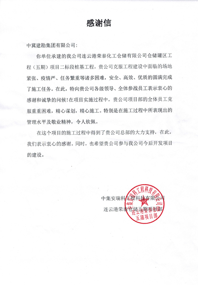 連云港榮泰化工倉儲有限公司倉儲罐區工程(五期)項目二標段樁基工程,業主在表揚信中說:貴公司克服工程建設中面臨的場地緊張、疫情嚴、任務繁重等諸多困難,安全、高效、優質的圓滿完成了施工任務。貴公司項目部全體員工克服重重困難,精心謀劃,精心施工。特別是在施工中所表現出的管理水平及敬業精神,令人欽佩。
