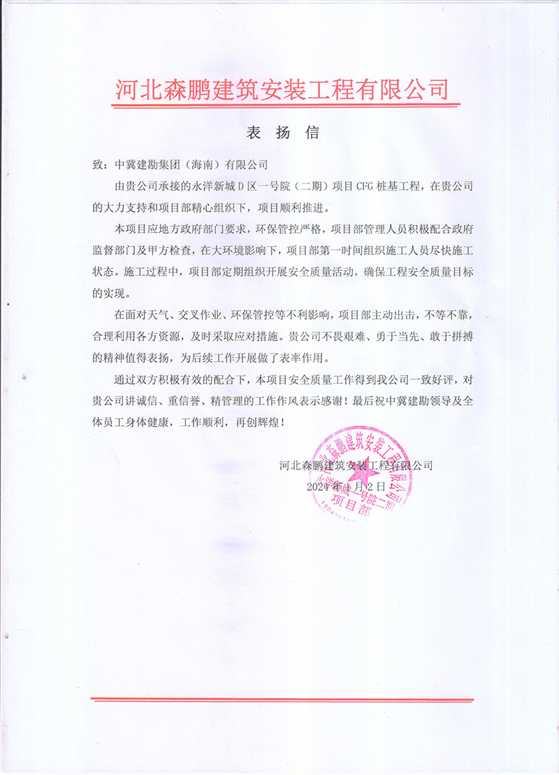 廣西北海氧化鋁項目樁基工程工程自2023年2月24日開工,至12月15日完成合同內全部樁基施工任務,在此期間,項目部全體成員一直堅持安全第一的理念,實現了工程建設“零缺陷、零傷害、零事故、零污染”的安全管理目標,施工過程中克服種種困難,順利實現了業主方制定的節點目標,獲得業主單位的肯定與褒獎,送出表揚信,為主要管理人員頒發獎狀。為后續施工工作的開展提供了可靠保障,贏得了業主及相關各方的認可。