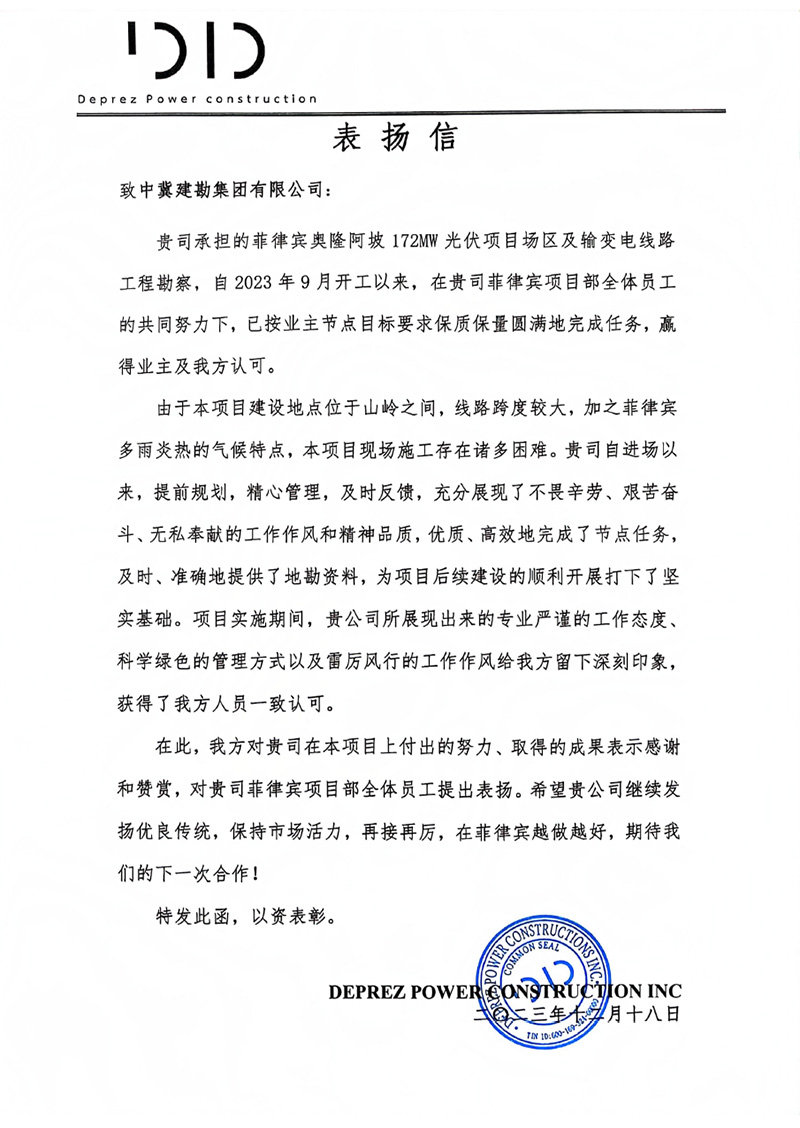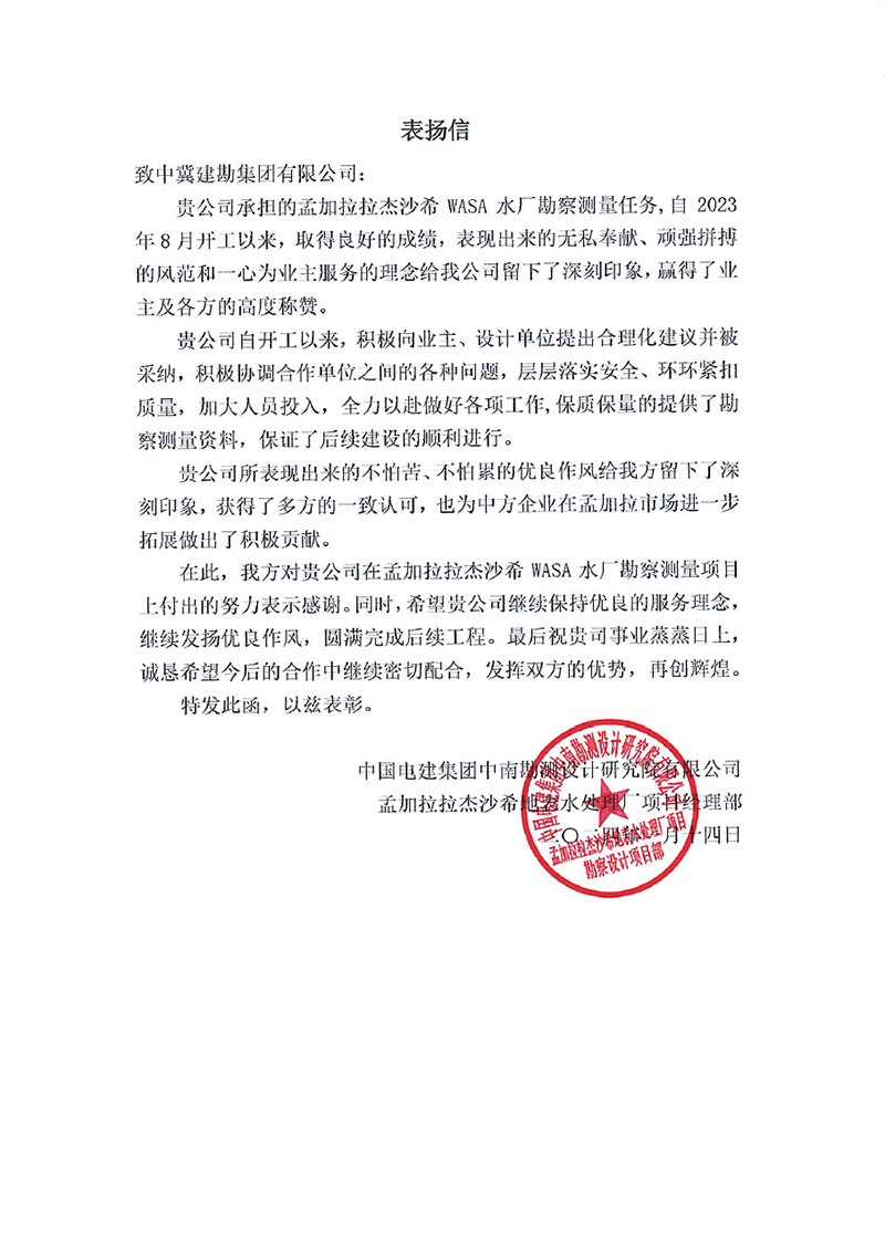 中國機械設(shè)備工程股份有限公司發(fā)來的表揚信,對在烏茲別克斯坦謝拉巴德 500MWp/456.6MWac 太陽能電站項目建設(shè)過程中,項目全體人員克服諸多不利因素,發(fā)揚建勘精神,盡一切努力推進工程建設(shè),以及公司的專業(yè)性、敬業(yè)態(tài)度和管理水平給予了高度評價。同時,對項目管理團隊及所有參建人員表示由衷的感謝,并希望雙方精誠合作,攜手并進,共同推進其他項目的開發(fā)建設(shè)。