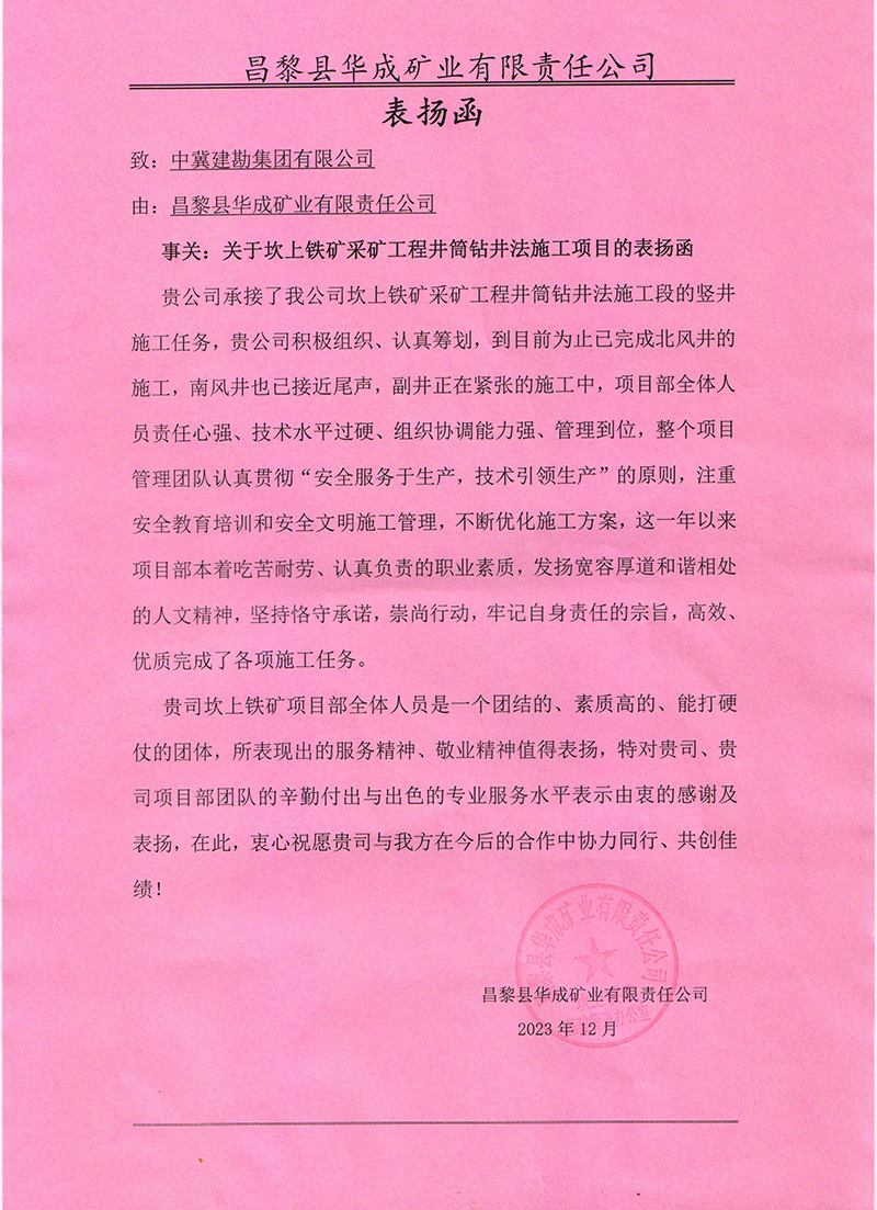 昌黎縣華成礦業(yè)有限責任公司發(fā)來的表揚函,對我公司在坎上鐵礦采礦工程井筒鉆進法施工項目施工過程中,積極組織,認真籌劃,以及項目部全體人員責任心強、技術(shù)水平過硬、組織協(xié)調(diào)能力強、管理到位,認真貫徹“安全服務于生產(chǎn),技術(shù)引領(lǐng)生產(chǎn)”的原則,不斷優(yōu)化施工方案,已順利完成北風井的施工,南風井也即將完成,表示由衷的感謝和表揚,希望今后合作中協(xié)力同行、共創(chuàng)佳績。
