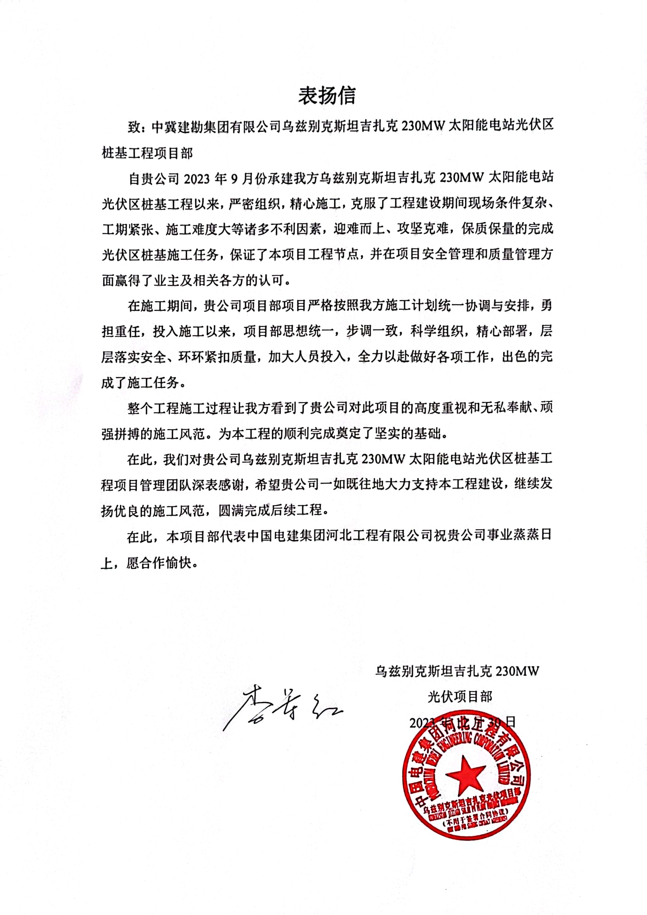 中國電建集團河北工程有限公司發(fā)來的表揚信,對在烏茲別克斯坦吉扎克230MW太陽能電站光伏項目施工期間,項目部思想統(tǒng)一,科學組織,精心部署,層層落實安全、環(huán)環(huán)緊扣質(zhì)量,全力以赴做好各項工作的奮斗精神,給予了高度評價和感謝。