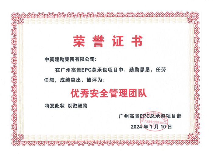 中國電子系統(tǒng)工程第四建設(shè)有限公司發(fā)來的表揚信,對我公司在廣州高景太陽能科技有限公司高效光伏組件項目建設(shè)過程中,公司的大力配合和項目部全體人員的共同努力下,安全管理體系覆蓋到位,質(zhì)量保證措施到位,嚴格把控質(zhì)量、安全關(guān),出色完成了施工任務,特向我公司各級領(lǐng)導、全體參建員工表示衷心的感謝,并授予“優(yōu)秀安全管理團隊”和“優(yōu)秀資料包商”榮譽。