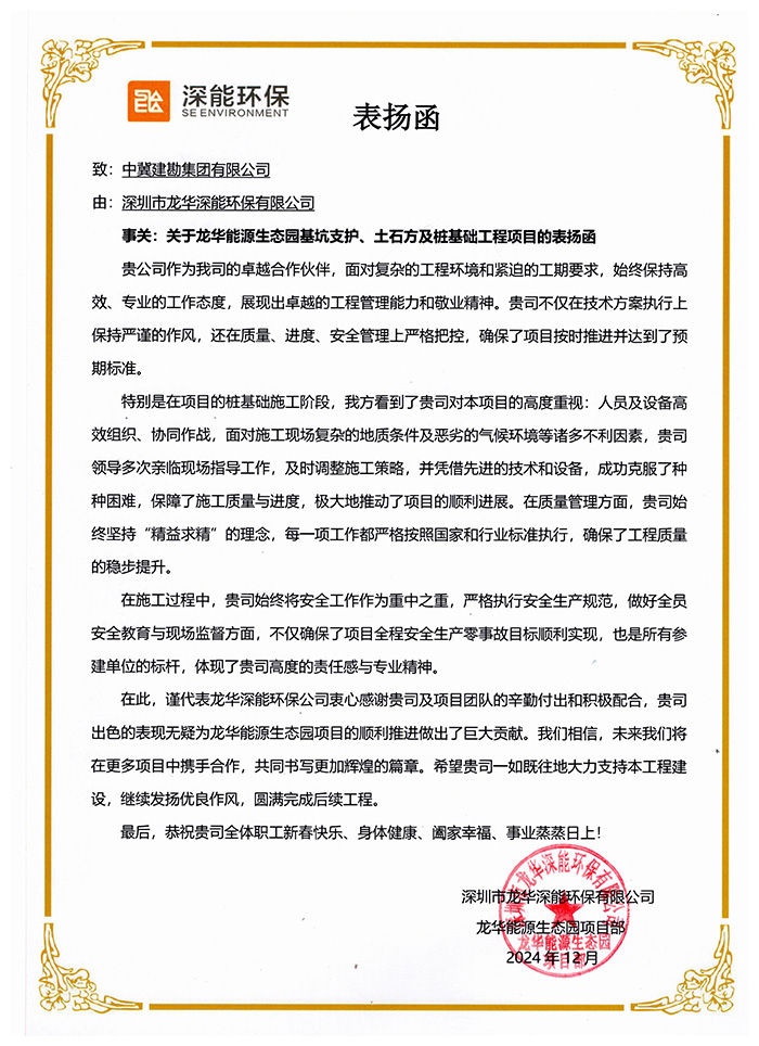 2024年12月20日,深圳市龍華深能環保有限公司發來表揚信,對我公司正在施工的龍華能源生態源基坑支護、土石方及樁基礎工程項目在施工過程中,面對復雜的工程環境和緊迫的工期要求,始終保持高效、專業的工作態度,展現出卓越的工程管理能力和敬業精神,在技術方案執行上嚴謹的作風,質量、進度、安全管理上嚴格的把控,以及我公司領導多次親臨現場指導工作,確保了項目按時推進并達到了預期標準,表示了衷心的感謝,并表達了未來將有更多的項目攜手合作。