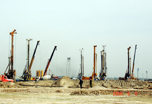 樁基采用鉆孔混凝土灌注樁和振沖碎石樁,灌注樁樁徑800mm,樁長20~30m,混凝土總量62000余立方,振沖碎石樁53000余立方。